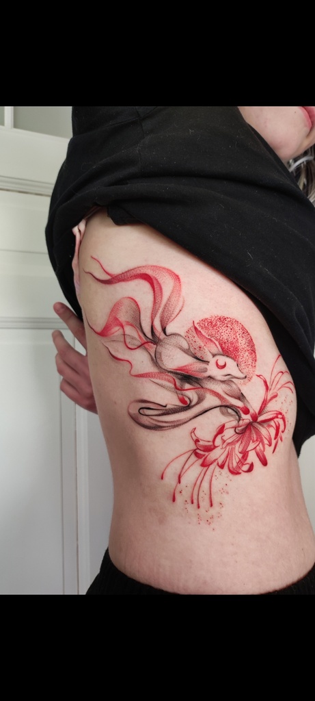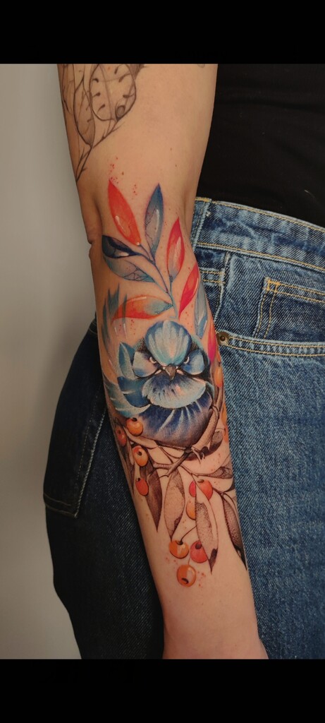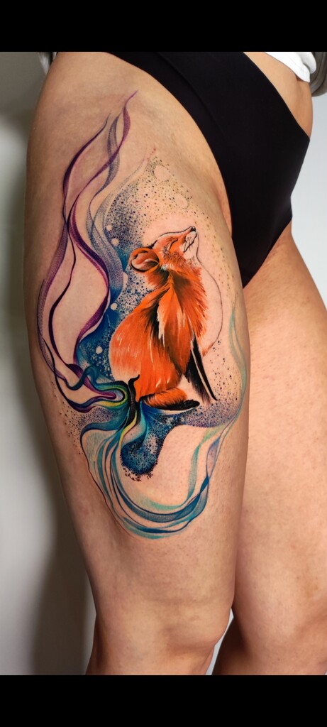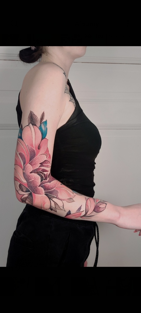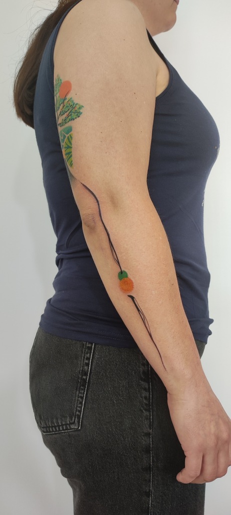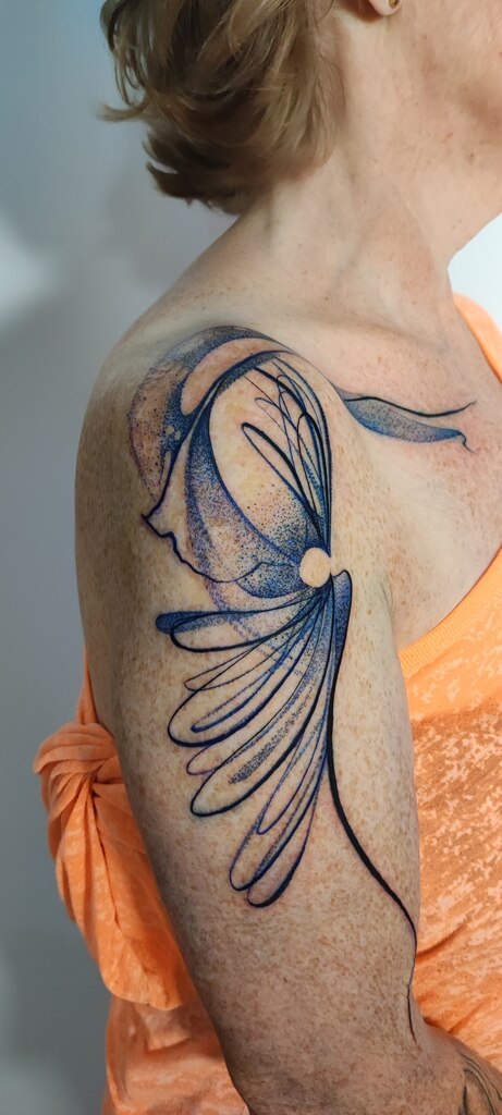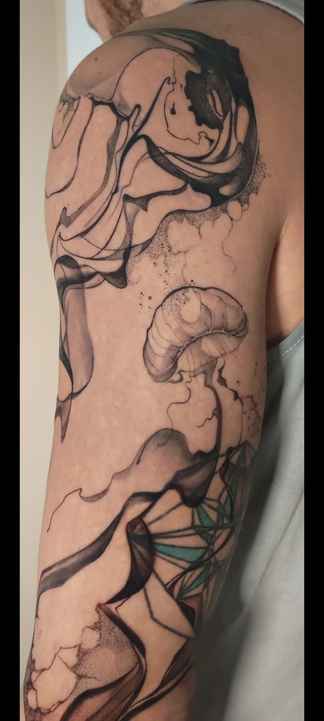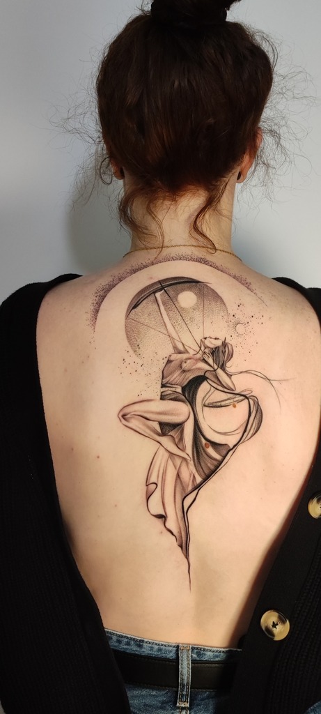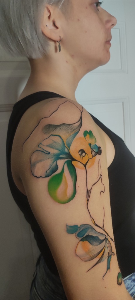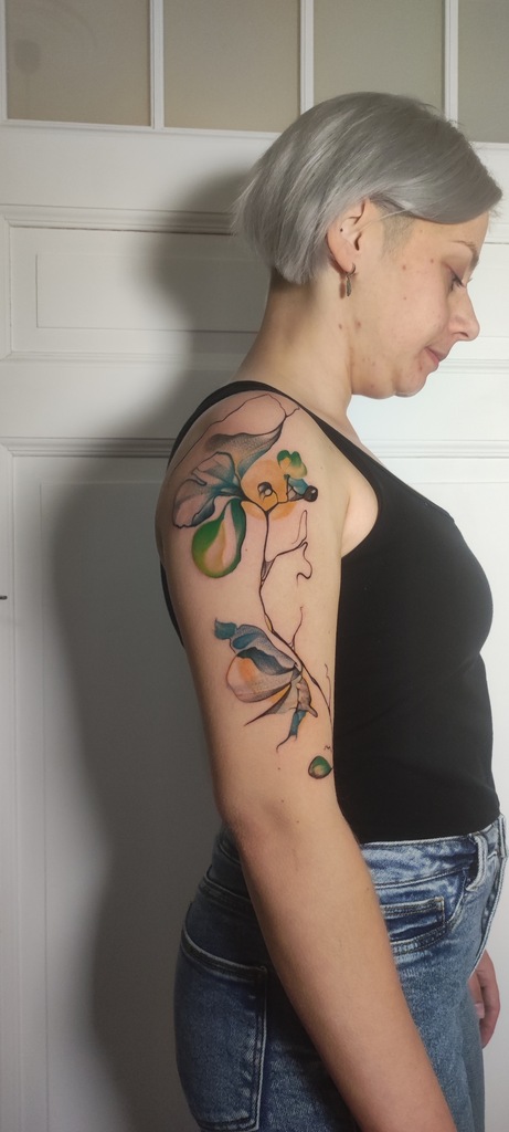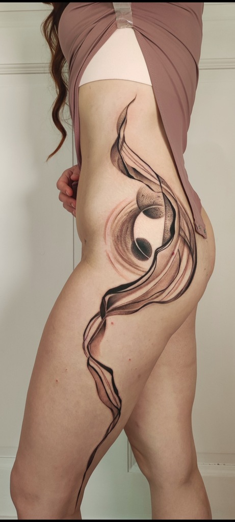 W moich tatuażach widać zamiłowanie do eklektyzmu i form nieoczywistych. Kocham abstrakcję właśnie za jej enigmatyczność i swobodę. Tak naprawdę tatuaż powstaje w trakcie — już na skórze — projekt to tylko koncept. Sama jestem ciekawa końca. Najlepszy efekt jest u osób, które puszczają kontrolę i pozwalają, żeby wszystko samo płynęło.