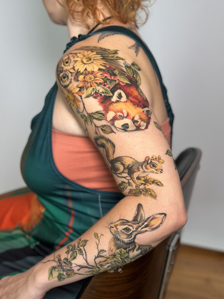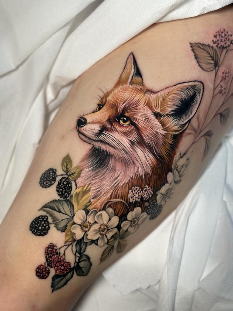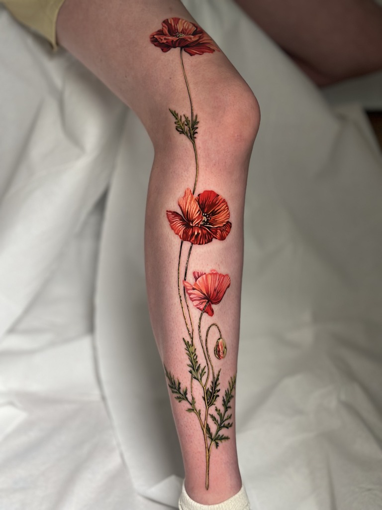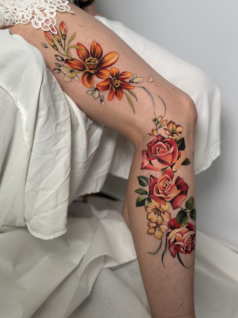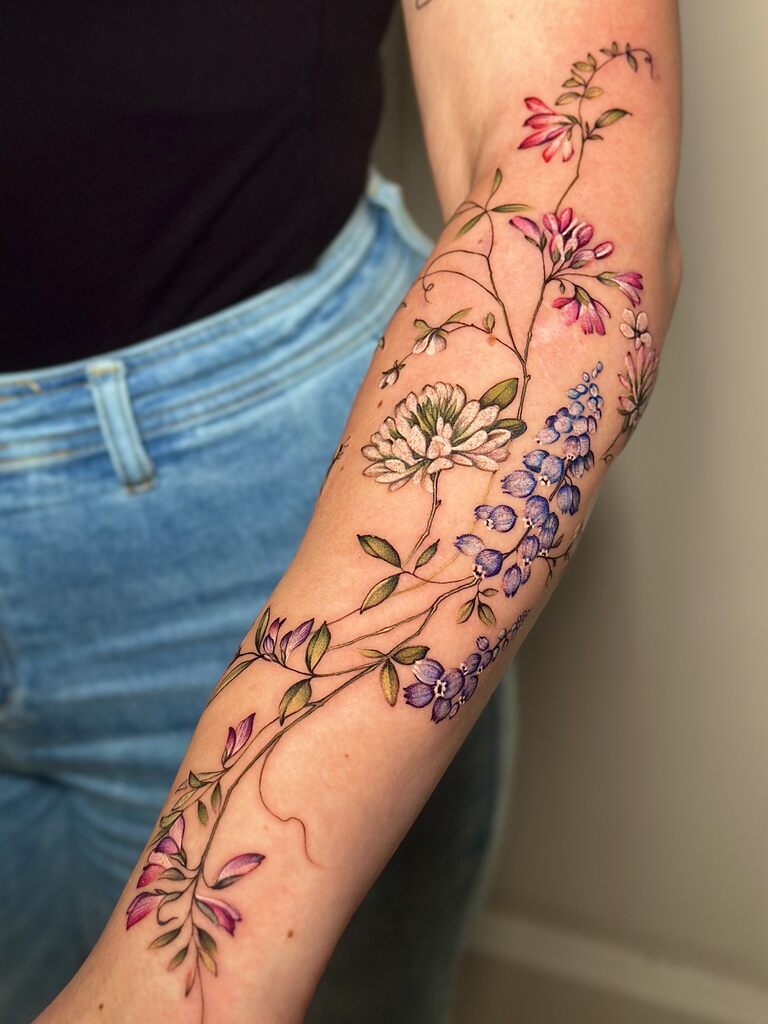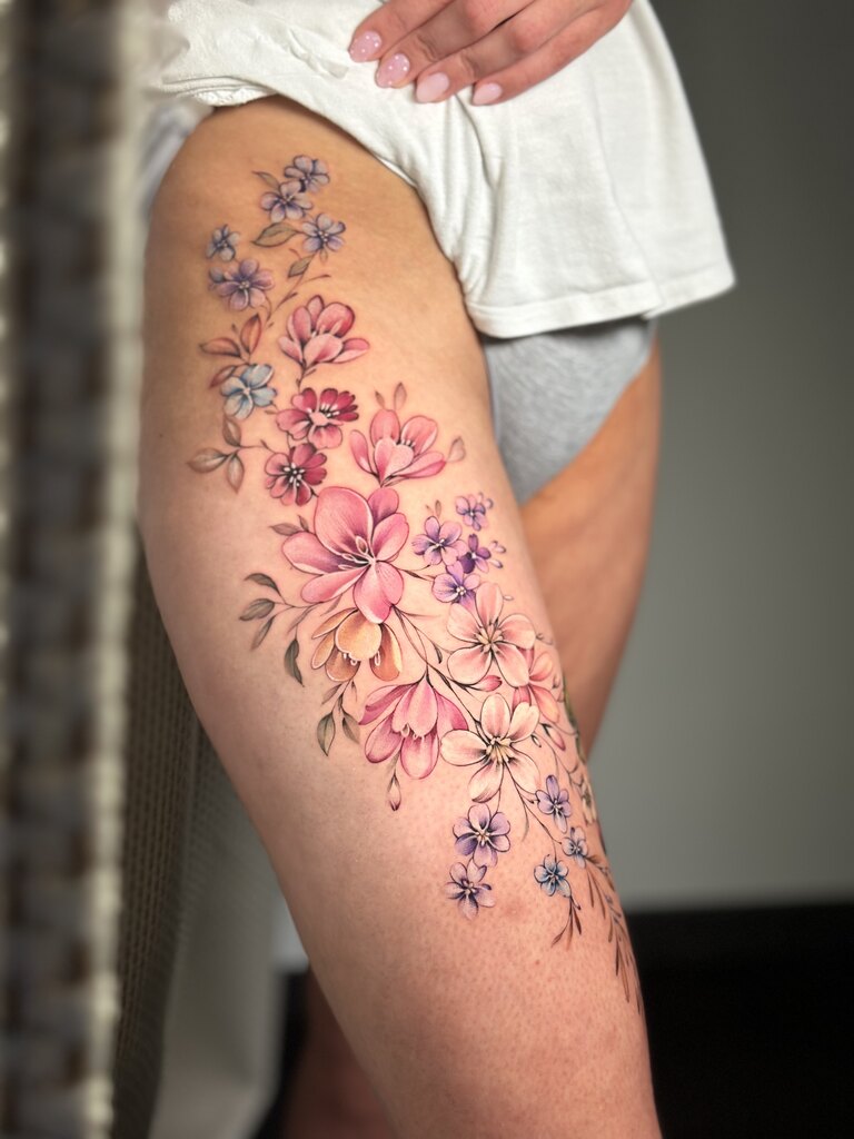 Tworzę tatuaże inspirowane naturą – realistyczne w formie, a jednocześnie miękkie i malarskie w wyrazie. Najbliższa jest mi estetyka botaniczna, jednak chętnie pozwalam sobie na swobodną interpretację motywów. Dlatego w moich projektach pojawiają się motyle ze skrzydłami z kwiatów czy inne baśniowe, nieoczywiste formy.